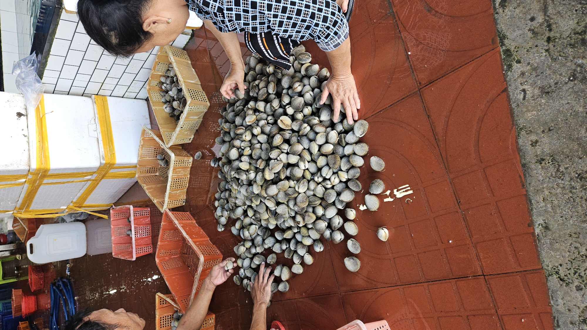 An overhead shot depicts two people sorting a large pile of cockles on a wet, red-tiled floor in what appears to be an outdoor market setting in Nam Nha Trang, Vietnam. An older woman with dark hair pulled back is wearing a patterned shirt and uses both hands to sift through the cockles. A second individual, only partially visible from the lower-left corner, is also sorting the cockles with one hand. Several plastic baskets in various colors (orange, tan, red) are scattered around, some containing cockles. There are several large white styrofoam coolers secured with yellow tape stacked against a white tiled wall behind the woman. A white plastic jug is visible beside the coolers. The floor is partially wet. The scene gives the impression of a typical seafood sorting activity, potentially for commercial sale.