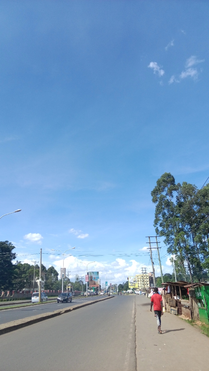 A long, straight road stretches into the distance under a clear blue sky with sparse clouds. A pedestrian in a red shirt walks along the right-side sidewalk. The road has cars and streetlights, with trees lining the sides. A row of small, informal structures sits next to the sidewalk. Power lines run overhead, adding to the urban landscape. Billboards are seen in the distance.