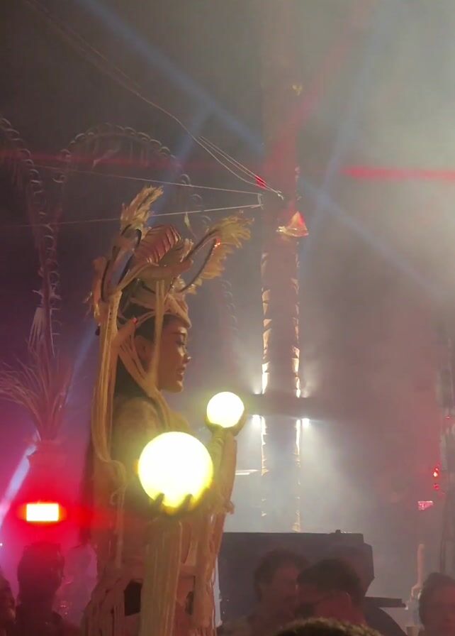 A woman is performing at an outdoor event at night. She wears a white outfit with fringe and an elaborate headpiece. The headpiece has ram-like horns, feathers and a reflective circle. The woman is holding two glowing yellow orbs and raising her hands. The orbs appear to be plastic globes that are illuminated. The lighting at the event is primarily red, with white spotlights illuminating a palm tree behind the woman. The crowd is mostly blurred, but some people are visible watching the performance. The overall atmosphere is festive and energetic.
