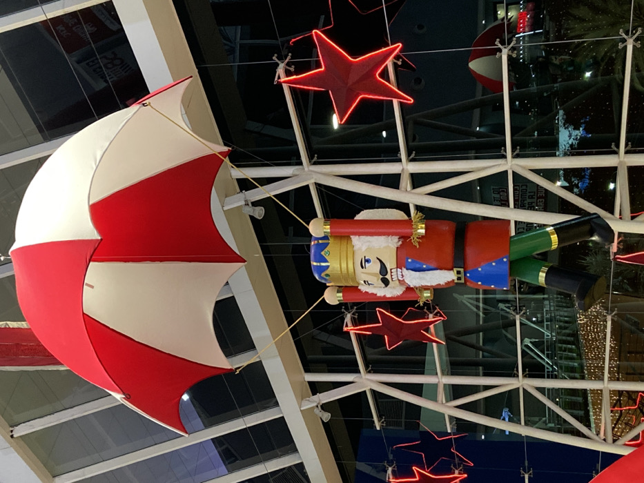 A whimsical indoor scene displays Christmas decorations suspended from a white ceiling grid. A large, red and white umbrella-like structure is on the left, tethered by strings. A giant nutcracker is positioned horizontally, wearing a blue crown and a red suit. Illuminated red stars are scattered around, adding a festive touch. Reflected lights and patterns are visible on glass surfaces in the background. The scene suggests a mall or public space decorated for the holiday season.