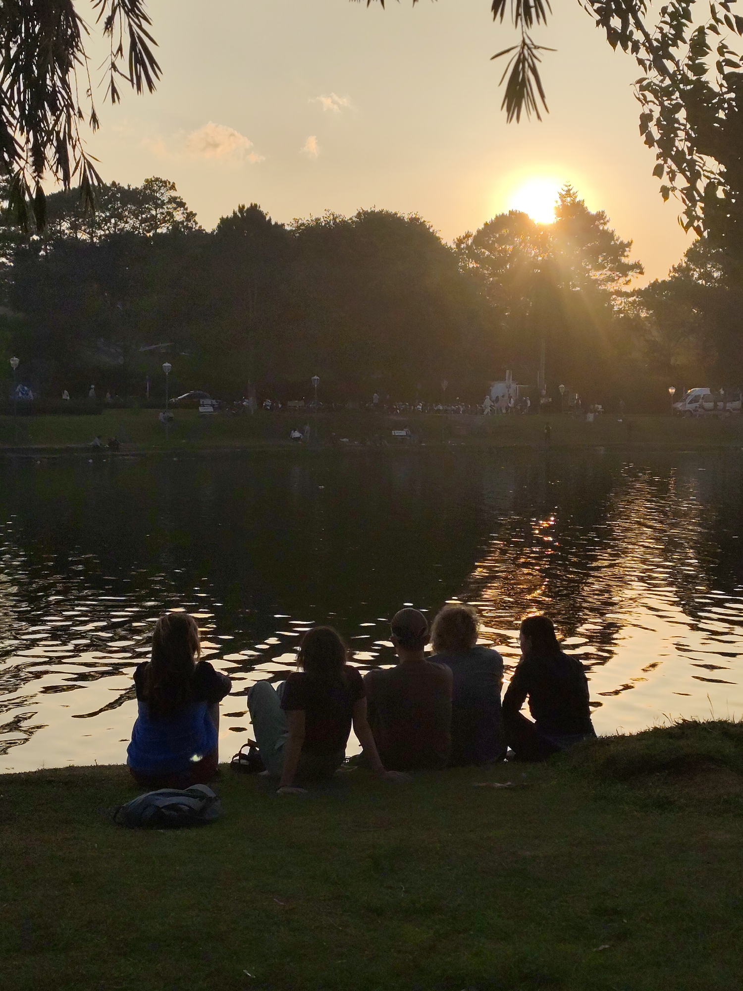 Five people are sitting on the bank of a lake at sunset. The setting sun reflects off the water. In the background are trees, streetlights, and other people. The scene is possibly in Da Lat, Vietnam.