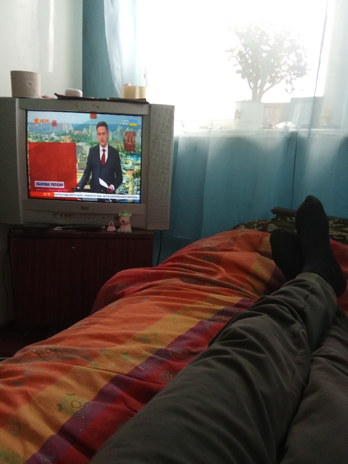 The image depicts an indoor scene in Yarun, Ukraine, viewed from the perspective of an individual resting on a bed. In the foreground, the lower legs and feet of a person are visible, clad in dark grey sweatpants and black socks, propped up on an orange, red, and purple patterned duvet. Directly opposite the bed, a grey CRT television set sits on a dark brown wooden cabinet. The television screen displays a male news anchor in a dark suit and red tie, holding papers, against a backdrop of a city skyline. Ukrainian text, including "ІСТV" and "ОБОРОНА УКРАЇНИ" (Defense of Ukraine), is visible on the screen. On top of the television, two rolls of what appear to be toilet paper and a small white object are present. Two small figurines, one resembling a pink pig with a green hat and another a pink handbag, are situated on the cabinet below the TV screen. To the right of the television, a brightly illuminated window with light blue curtains reveals a potted plant and other indistinct objects on the windowsill, indicating daytime. The walls appear to be a light blue color.