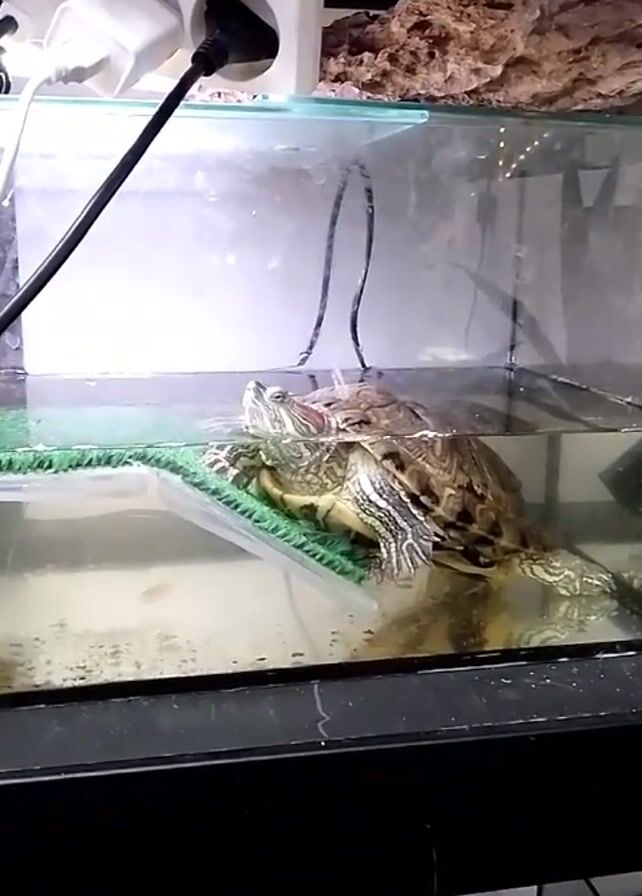 turtle in a glass tank with shallow water. The turtle is resting on a green, grassy platform that slopes up from the bottom of the tank. It has a patterned shell and is looking upwards. An electrical outlet with two plugs and wires is visible on top of the tank. A decorative rock is also on top of the tank. The tank sits on a black base.