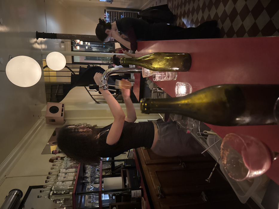 The image displays the interior of a Parisian bar or restaurant. A female bartender with dark, curly hair, wearing a black t-shirt and grey trousers, is positioned behind a red-topped bar counter. She is actively pouring a light-colored beverage from a chrome tap into a clear glass held in her left hand. To her right, a female customer with dark hair tied back, dressed in a dark top, stands at the bar, leaning forward with her right hand supporting her chin while looking downwards at the counter. The bar area features multiple clear liquor bottles with white labels arranged on black metal shelving behind the bartender. A wooden cabinet with dark drawers is visible beneath the counter. On the red bar surface, two empty dark green wine bottles are prominent, along with several empty glasses and a small votive candle in a clear holder. In the immediate foreground, a glass with a pink-red rim and residue is partially visible. The ceiling features two large, spherical white pendant lights. A dark spiral staircase is visible in the background, leading to an upper floor, with blurred figures of other patrons visible in the dimly lit dining area beyond. The floor on the customer's side of the bar is covered in a checkered pattern of reddish-brown and cream-colored tiles. A wooden speaker box and a rectangular mirror are mounted on the wall behind the bar.
