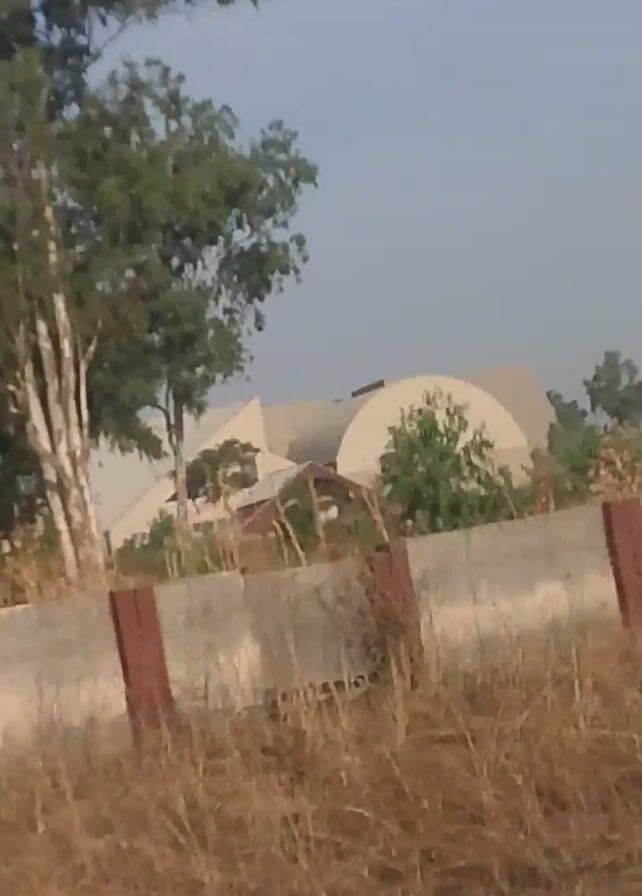 somewhat tilted, low-angle view of a building with a large, curved, off-white facade. A concrete walkway with intermittent brown accents runs parallel to the edge of the frame. The walkway is flanked by grassy areas, with a denser patch of dry vegetation and low bushes on the right. Green trees are visible on the left side of the frame, partially obscuring the building. The sky is visible above the building and trees and appears to be overcast.