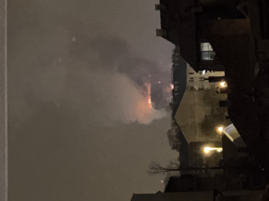 - "At night, thick smoke obscures a fiery blaze in the distance, viewed between silhouetted urban buildings" by FM-Y1Zvi1, licensed under CC BY 4.0