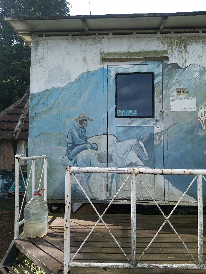 An old, weathered building features a mural of a cowboy riding a horse against a mountain backdrop. A door with a small window is painted to blend with the artwork. A white, rusty metal railing surrounds a wooden deck in front of the building. A large, clear water bottle with a red cap sits on the deck next to the railing. The building's exterior shows signs of age and wear.