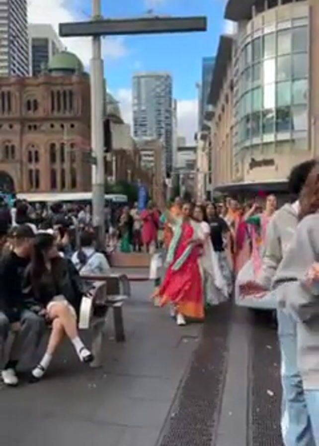 crowded city street with people sitting on benches and walking by. A group of women in colorful traditional Indian clothing are dancing in the street. The buildings in the background are tall and modern. The sky is blue with some clouds. One woman walks past the camera in a gray sweater.