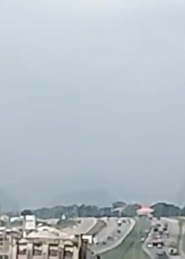 view from a slightly elevated position, likely a vehicle, looking out over a city landscape. In the foreground, a highway with multiple lanes curves through the scene with cars and other vehicles traveling on it. A yellow auto rickshaw and a motorcyclist are visible on a road running parallel to the highway, closer to the camera. Streetlights line the roads. Buildings, some with blue roofs, are scattered across the landscape, and a large building with a distinctive pink dome is visible in the distance. Mountains can be faintly seen in the background, blending into the overcast sky. The overall tone of the scene is muted due to the cloudy weather.
