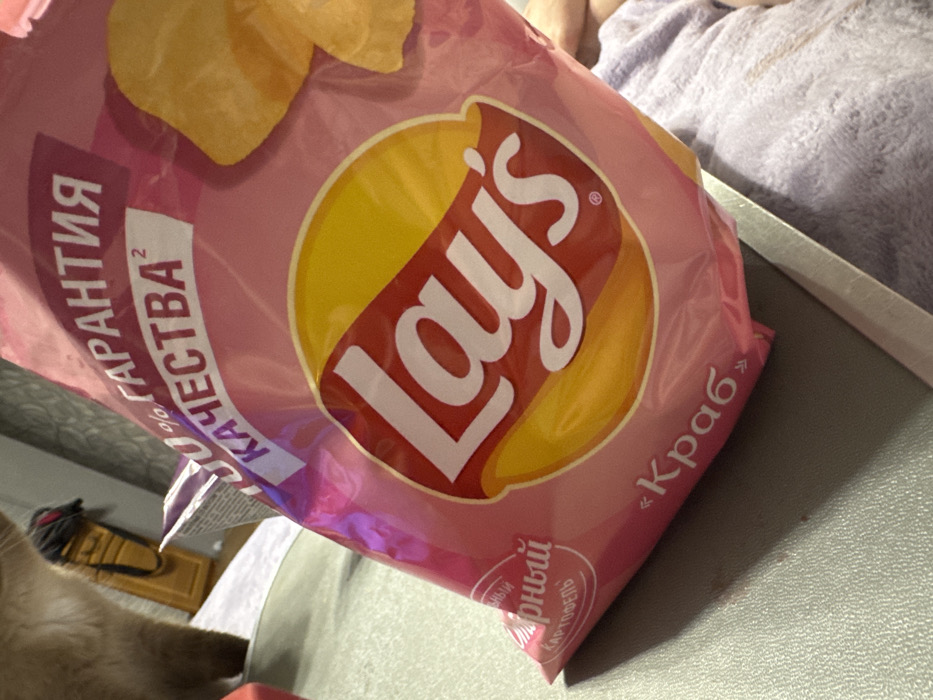 A pink bag of Lay's potato chips with a crab flavor is shown. The Lay's logo is prominently displayed in red and white on a yellow background. Cyrillic text appears on the bag, including words like "Guarantee" and "Quality." The chip bag is slightly crumpled, with a few visible chips. The backdrop includes a gray surface, a section of a purple blanket, and the edge of what appears to be a cutting board. A small portion of a cat is visible in the lower-left corner.