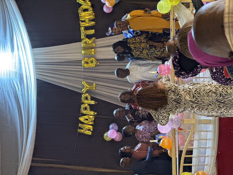 The image depicts an indoor celebratory event, identified as a birthday celebration by gold foil "HAPPY BIRTHDAY" balloons strung across a dark backdrop