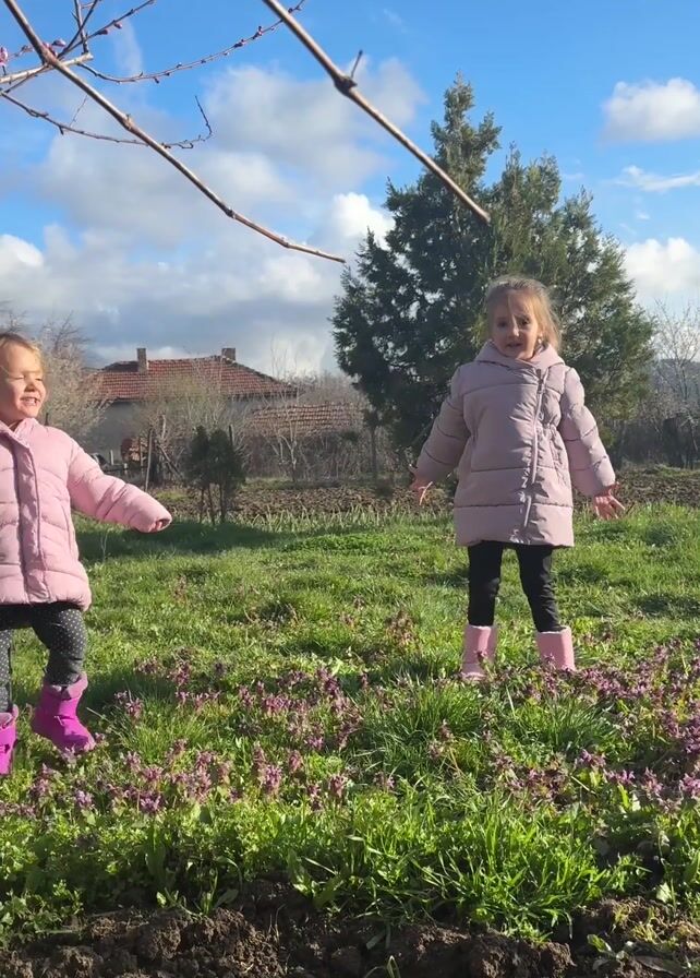 Two young girls in pink coats and pink boots dance in a grassy yard with purple flowers. One girl is slightly taller than the other. They spread their arms and twirl. Behind them are a few trees, a house, and a cloudy blue sky. A tree branch is in the foreground.
