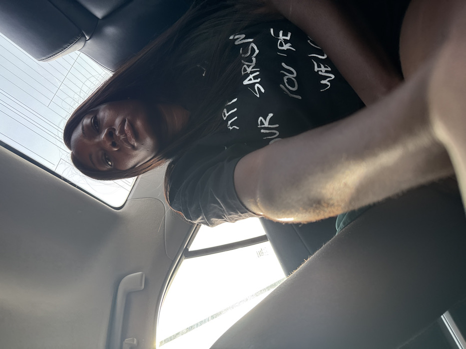 An adult female is depicted seated in the rear passenger compartment of a vehicle in Lugbe, Nigeria. She has dark skin and long, straight dark hair. She is wearing a dark, short-sleeved t-shirt with white text, partially visible as "YOUR SARCASTIC YOU'RE WELCOME". Her right arm is extended towards the camera, which she is holding. Her gaze is directed towards the camera, with a slightly pursed mouth. Strong natural light enters from the left side of the vehicle, illuminating parts of her arm and face and causing glare through the rear window, obscuring external details beyond a bright sky and faint linear structures. The vehicle's interior features dark upholstery and a white grab handle is visible above the left rear window.