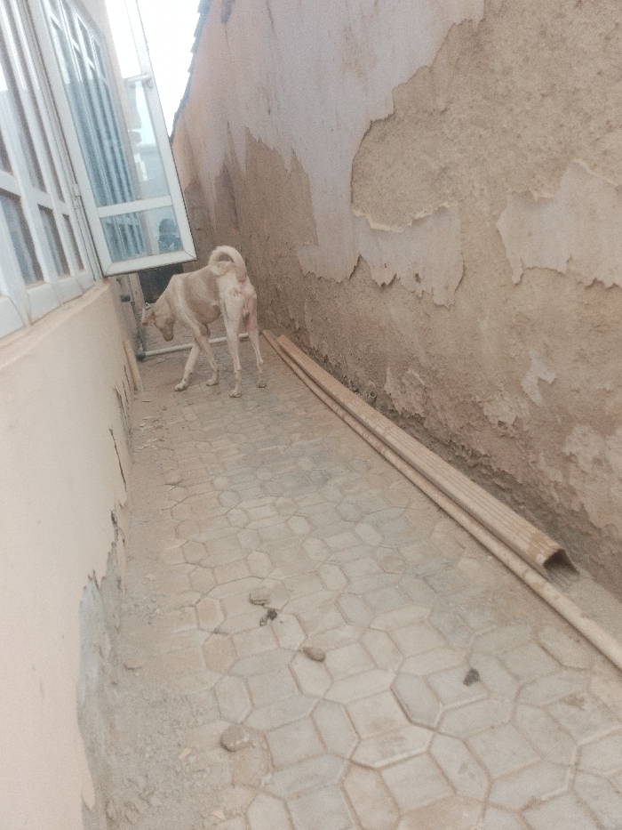 A light brown dog stands in a narrow walkway paved with hexagonal tiles. To the left, a building with white window frames is visible. To the right, a weathered wall exhibits peeling layers of paint or plaster. A series of pipes lay along the base of the wall. The scene is captured under natural light, with a slightly muted color palette.