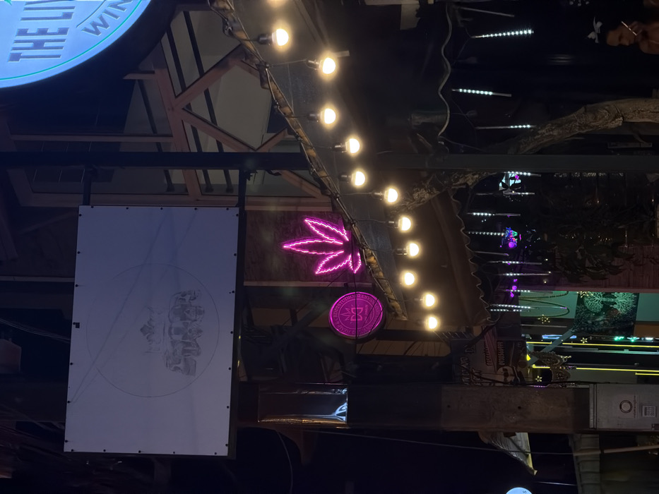 This image captures a nighttime street scene in Kamala, Thailand, characterized by various illuminated commercial signs and decorative lighting. Centrally positioned, a large, unlit white rectangular sign displays a faint outline of a circular logo depicting a crown atop several elephants. Below and to the right, a vibrant pink neon sign in the shape of a cannabis leaf is prominently displayed. Adjacent to it, a smaller circular pink neon sign reads "MEDICAL CANNABIS" with a "DC" initial logo. A string of warm white spherical lights hangs beneath a dark awning or roof structure, with multiple vertical white-blue LED 'raindrop' lights suspended below them. On the far right, a partial large blue circular sign with white text, beginning "THE LIV WINE", is visible. In the lower right corner, a person with dark hair tied back, wearing a light-colored top, is visible from the chest up, holding an object consistent with a cigarette or vape pen to their mouth. A small white butterfly adornment is discernible on their right shoulder. A utility pole occupies the left side of the frame, and glimpses of other green and blue neon lighting are visible from adjacent businesses at ground level.