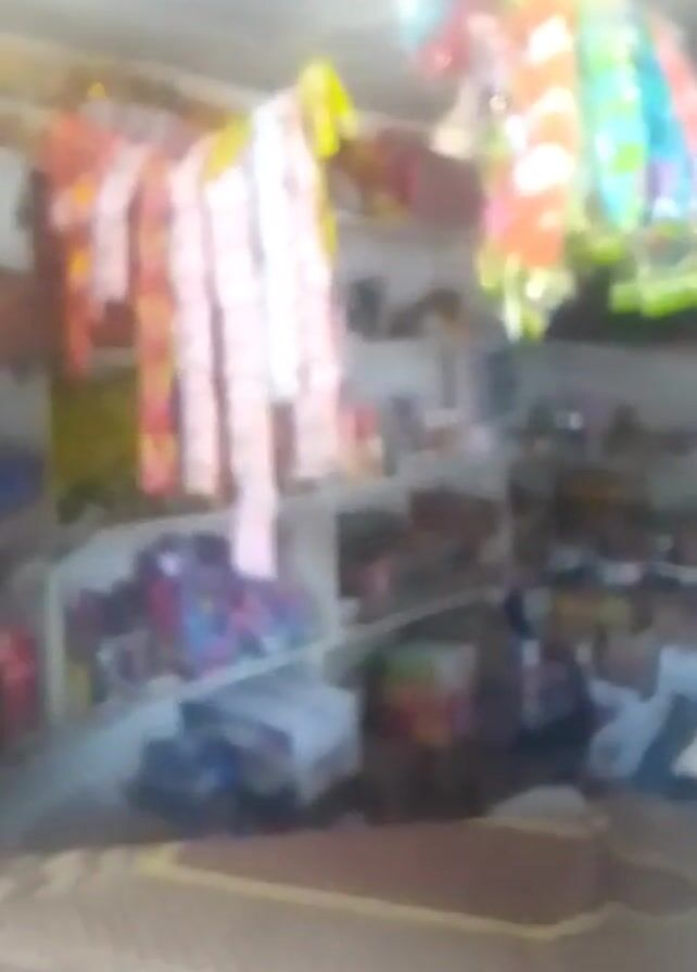 blurry interior of what appears to be a small shop. Shelves are stocked with various items, including what appear to be snacks and small packaged goods. Some colorful decorations hang from the ceiling. There's a patterned rug on the floor. A person briefly enters the frame on the left side, carrying a blue container. The camera is unsteady.