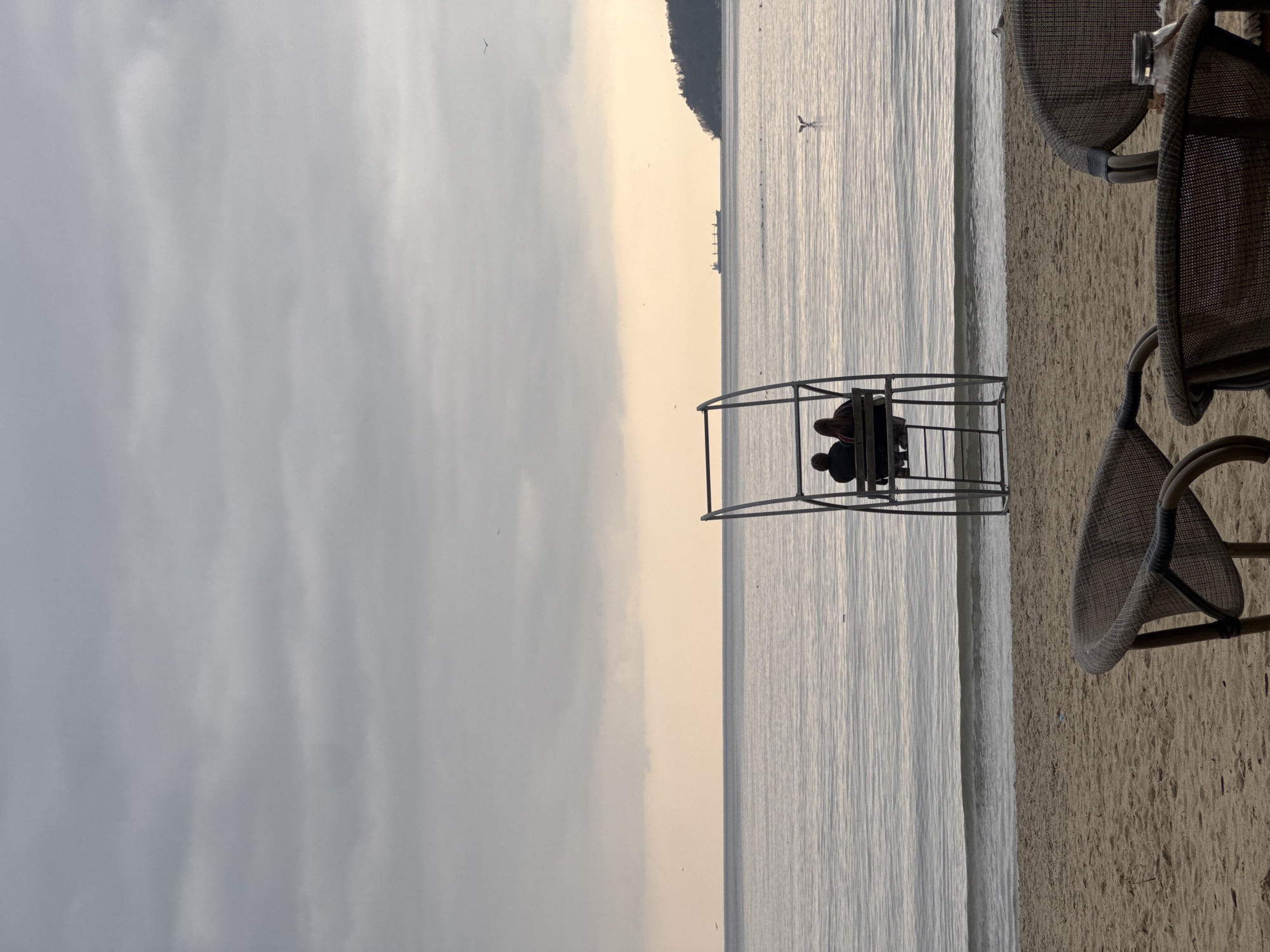A scene captured at the beach in Varna, Bulgaria. A pair of people are seated in a metal structure on the beach, overlooking the water. The sky is overcast with a greyish-white hue, while the water reflects a silvery-grey color. A distant ship is visible on the horizon, alongside land. A chair sits near the structure on the sandy beach.