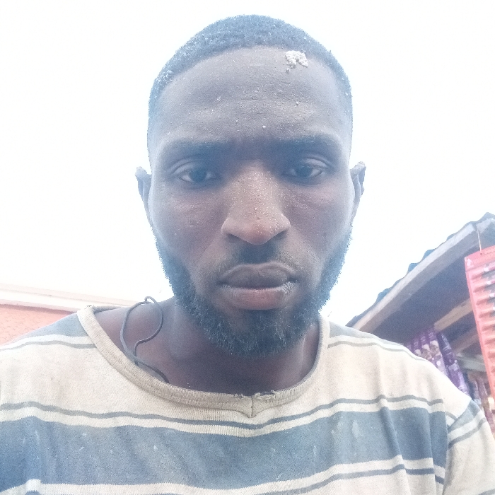 A man with a short, dark haircut and a beard looks directly at the camera. He has dark eyes and appears tired. He's wearing a worn striped shirt. There is some debris on his head and shirt. The background is out of focus, showing a partial view of a building and a cloudy sky. The overall image has a slightly washed-out, low-contrast appearance.