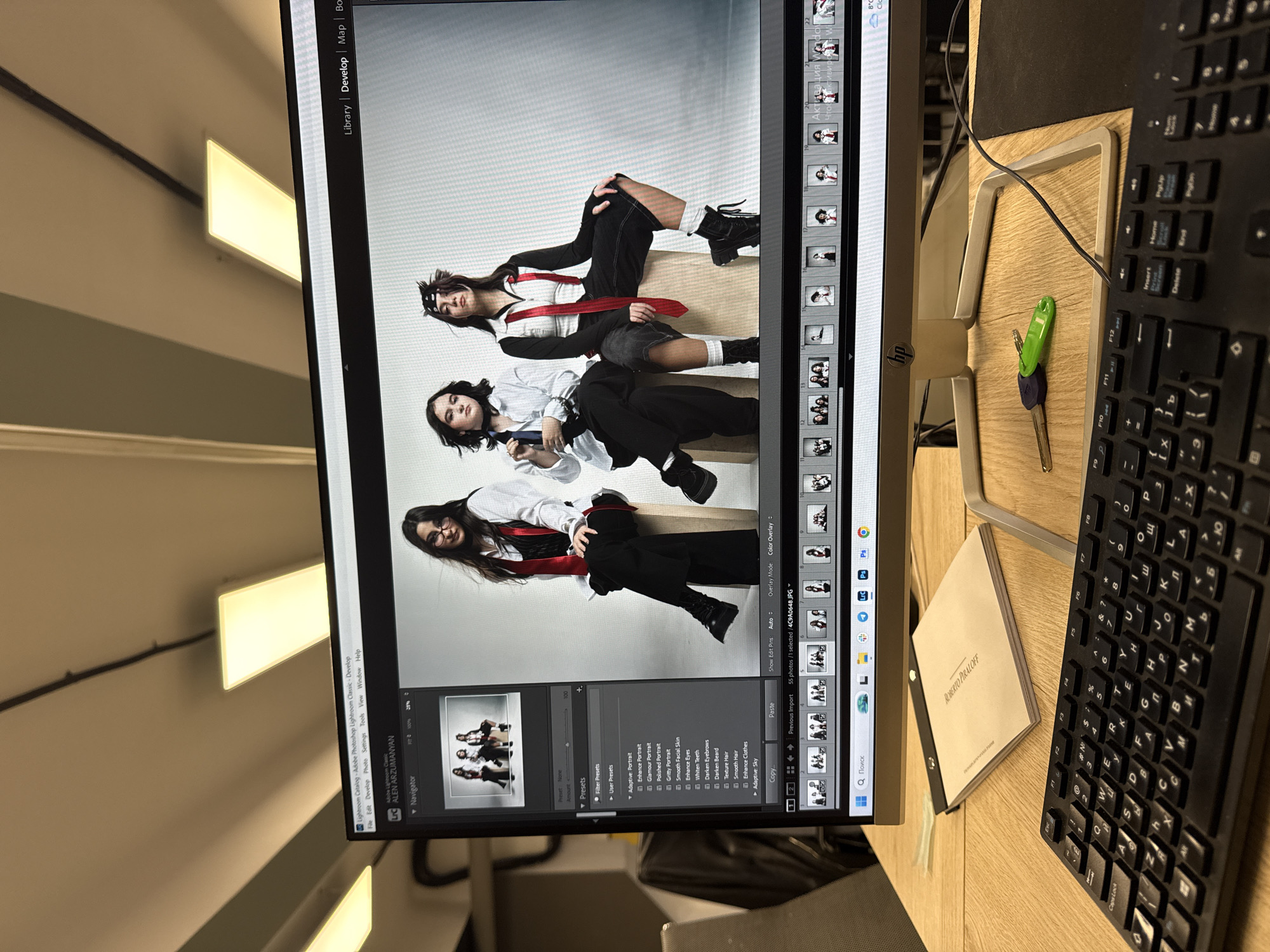 The image displays an indoor professional workspace in Yerevan, Armenia, centered on an HP computer monitor running Adobe Lightroom Classic. The software's title bar identifies the user as "ALEN ARZUMANYAN." The main display area shows an image from a photoshoot featuring three young women, styled in white shirts, dark vests, and ties (one red, others dark), dark pants or shorts, and boots. They are seated on light-colored cubic blocks against a plain light background. The Lightroom interface includes a navigator panel, a list of adaptive presets for portrait enhancements, and a filmstrip displaying 55 thumbnail images from the same photoshoot at the bottom. The monitor is positioned on a light wooden desk. In the immediate foreground, a black keyboard with both Latin and Cyrillic characters is present. To the right of the keyboard, a set of three keys—one metallic, one with a purple plastic head, and one with a green plastic head—are visible. To the left of the monitor stand, a small, light-colored notebook bearing the text "ROBERTO PICALLOFF" and "REVELATION" is placed. The background features a light-colored ceiling with multiple rectangular fluorescent light fixtures and dark cable conduits. A blurred office chair is partially visible on the left side of the scene. The precise location within Yerevan is not discernible beyond being an indoor professional environment.