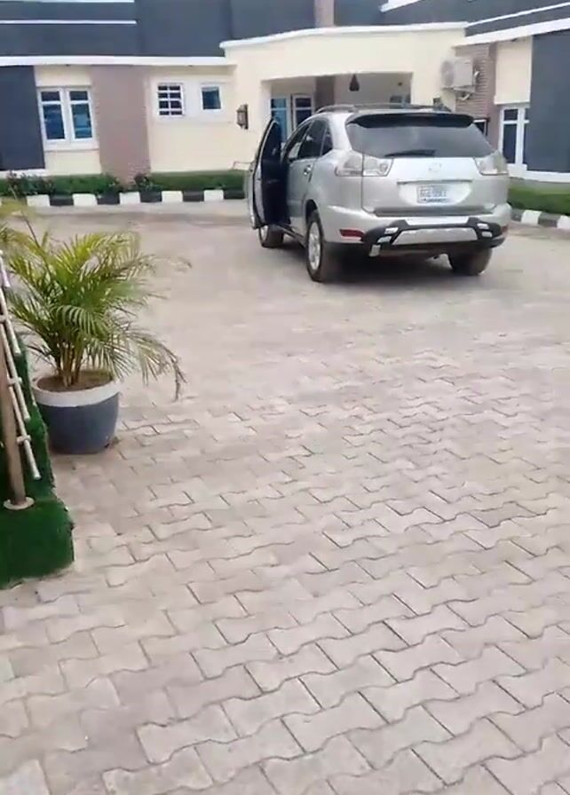 light-colored Lexus SUV parked in the brick-paved driveway of a modern house with a beige and gray color scheme. The car's driver-side door is open. The house has multiple windows and air conditioning units. A small potted palm plant sits on the left side of the frame, near a staircase with green artificial turf. The overall lighting suggests an overcast day. The camera slowly pans towards the house and car.