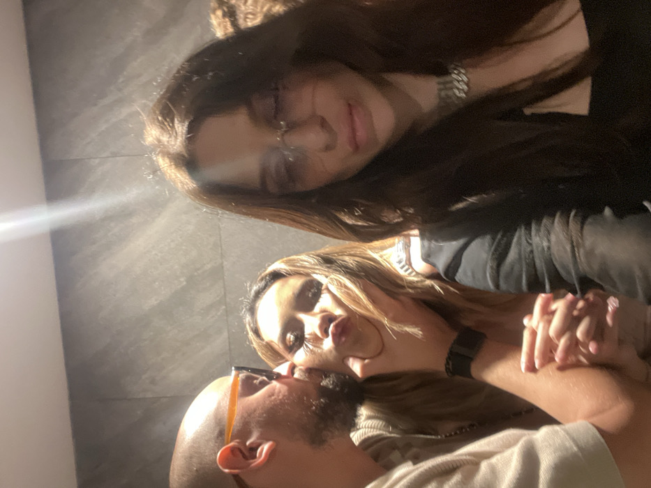 A selfie captures three people. A woman with long brown hair and glasses is at the top. Below, another woman with light brown hair puckers her lips towards a man with a shaved head, beard, and glasses. He looks upwards towards the camera. Their hands are clasped together. The lighting is somewhat dim, casting shadows across their faces. A bright light source shines on the left of the image.