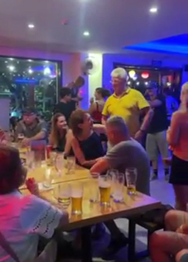 A group of people are in a brightly lit bar, seated at tables and standing near the bar. There are drinks on the tables, and a fan is spinning on the ceiling. A man in a yellow shirt is dancing with a woman in a black dress. Some of the people at the tables are watching them, while others are talking. The bar has blue lighting and hanging lanterns.