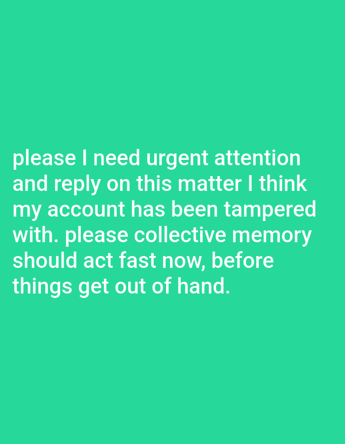 The image is a solid turquoise background with white text. The text expresses a sense of urgency and concern. It reads, "please I need urgent attention and reply on this matter I think my account has been tampered with. please collective memory should act fast now, before things get out of hand." The message suggests a possible security breach and implores collective action.
