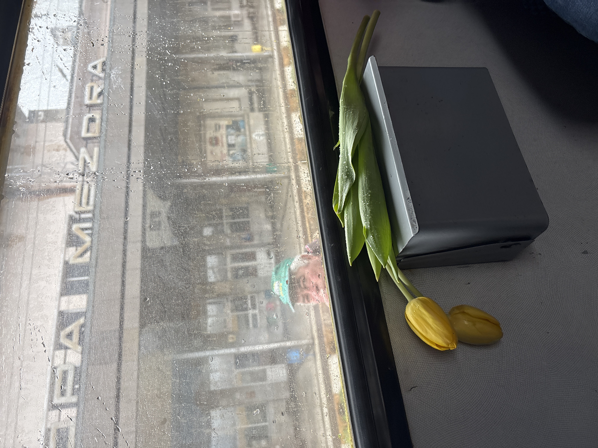 A rainy day in Mezdra, Bulgaria is observed from a train window. The reflection of a person wearing a hat can be seen in the glass. Two yellow tulips lie on a grey surface near a rectangular grey object. A sign with the word "MEZDRA" written in large letters is partially visible across the street.
