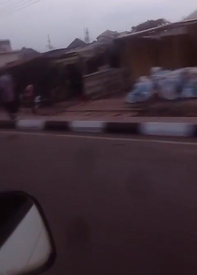 view from inside a car moving along a street. On the right side of the road, there are buildings and some construction materials. A person in red is seen walking. A large truck passes in the opposite direction. The sky is overcast. The car's side mirror is visible in the foreground.