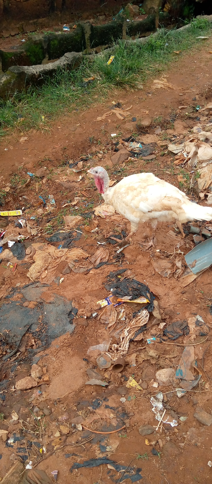 The scene depicts a white domestic turkey standing on reddish-brown soil in Onitsha, Nigeria