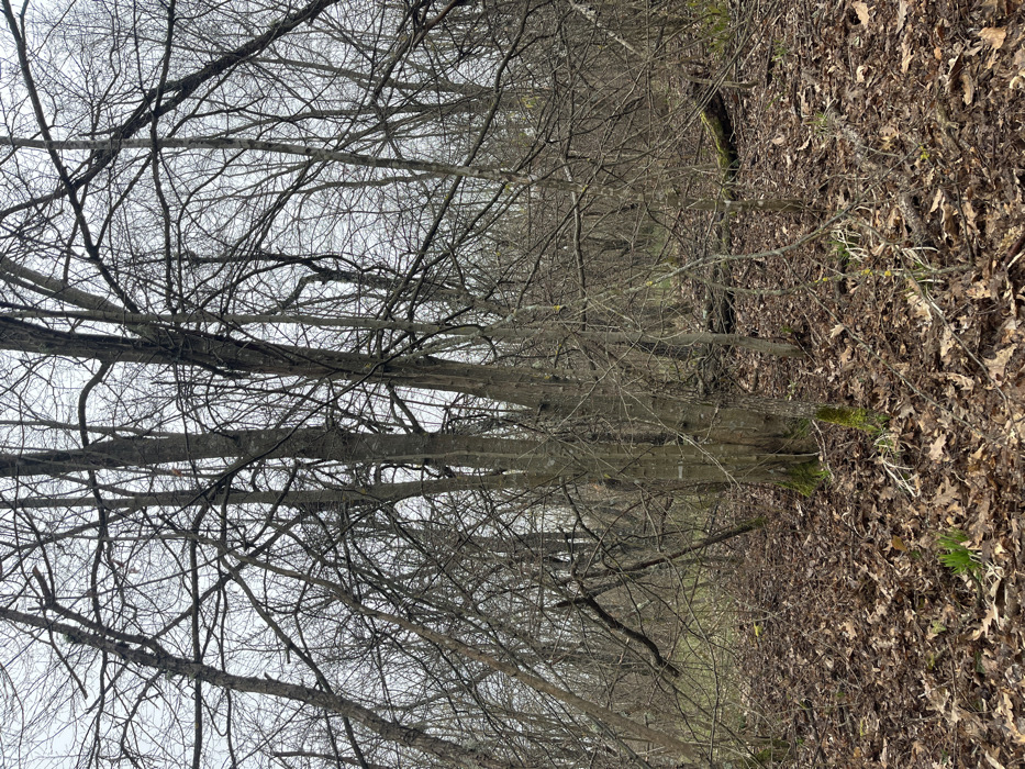 The scene depicts a dense deciduous forest in Unknown, Unknown, likely during late winter or early spring