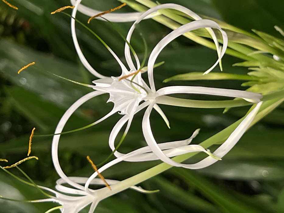 A white spider lily blooms, showcasing its unique petal structure