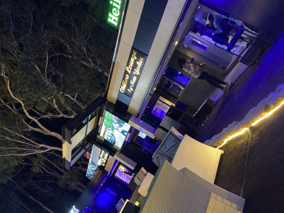 A nighttime shot shows a building with "Chillers Lounge by New Yorker" signage. A person stands outside, near a glass door with people inside. The building features a Heineken sign and a large outdoor screen displaying a city scene. Trees are visible in the background. Outdoor seating is arranged on the ground. A string of lights illuminates the edge of the area.