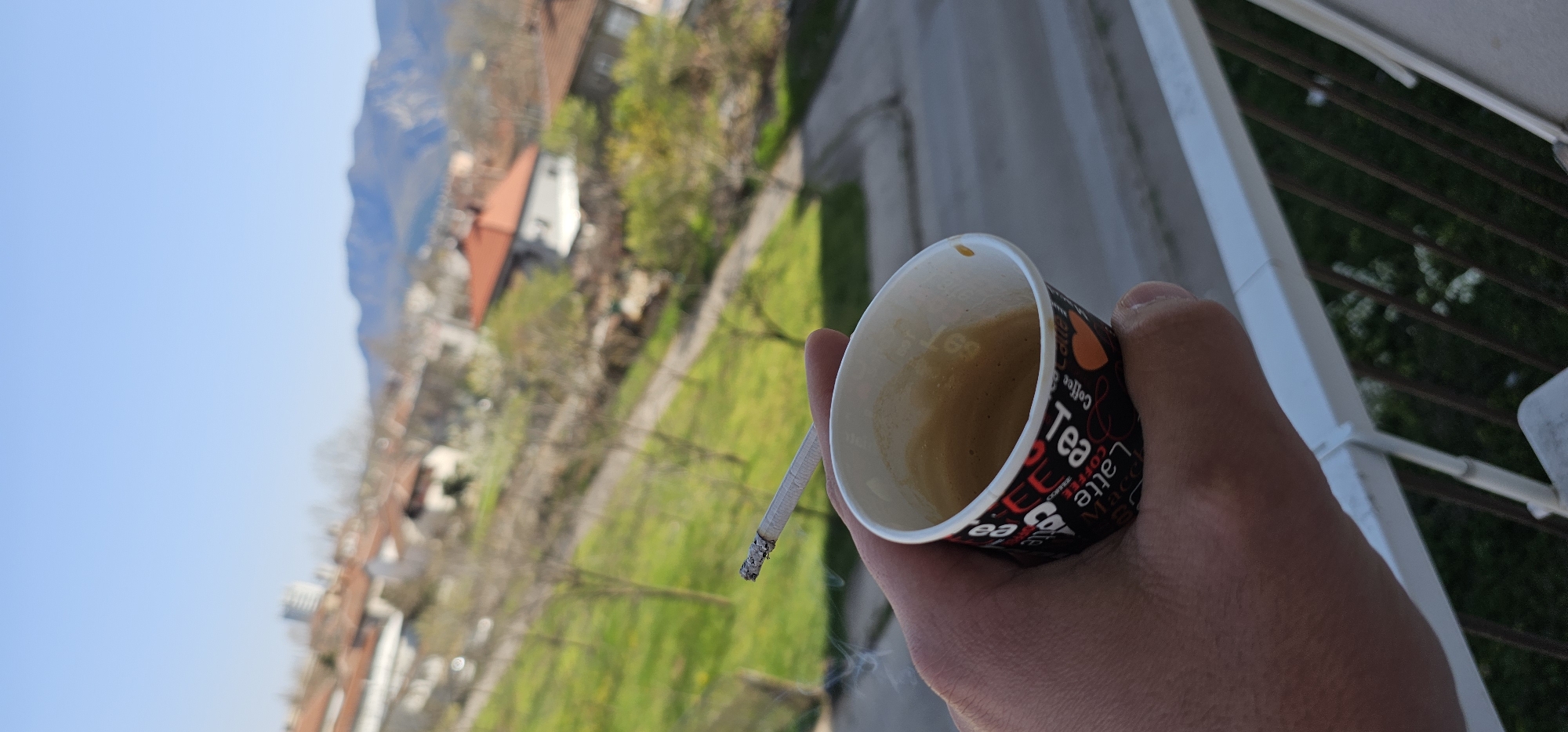 A hand holds a partially full paper coffee cup and a lit cigarette against a backdrop of a city landscape. The cup is black with white and red text, partially obscured, reading "Tea & Latte Coffee". A cigarette, partially burned with ash, is placed beside the cup. Smoke drifts from the cigarette. The background shows a cityscape with residential buildings, trees, and a clear blue sky. The location is implied to be Vratsa, Bulgaria. The scene appears to be captured from an elevated position, potentially a balcony. The image is rotated to the left.