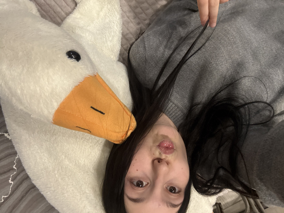 A high-angle, close-up photograph depicts a young female and a large goose-shaped plush toy in an indoor setting