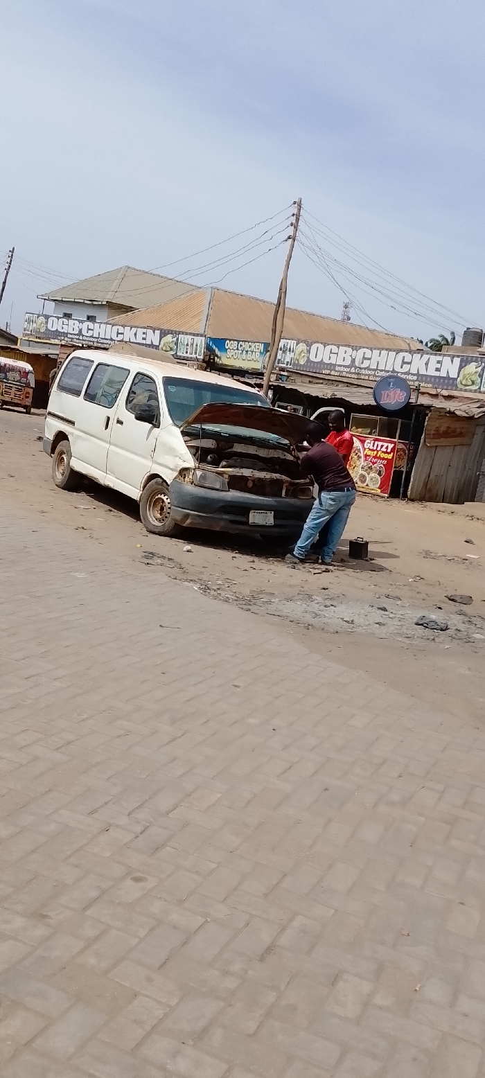 - "The image depicts an outdoor scene in Sabon Tasha, Nigeria, featuring two male individuals attending to a white van parked partially on a paved brick road and partially on a dirt shoulder" by FM-57m362, licensed under CC BY 4.0