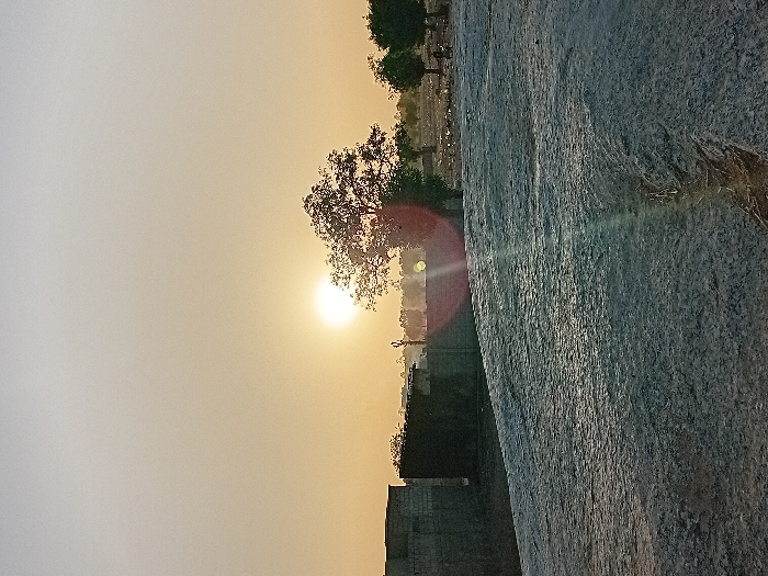 A hazy landscape at sunset features a bright sun partially obscured by a tree. A rough, grey surface dominates the right side, contrasting with the smooth, gradient sky. Buildings and more trees are visible in the middle ground, adding depth to the scene. A distinct lens flare adds a burst of red near the sun.