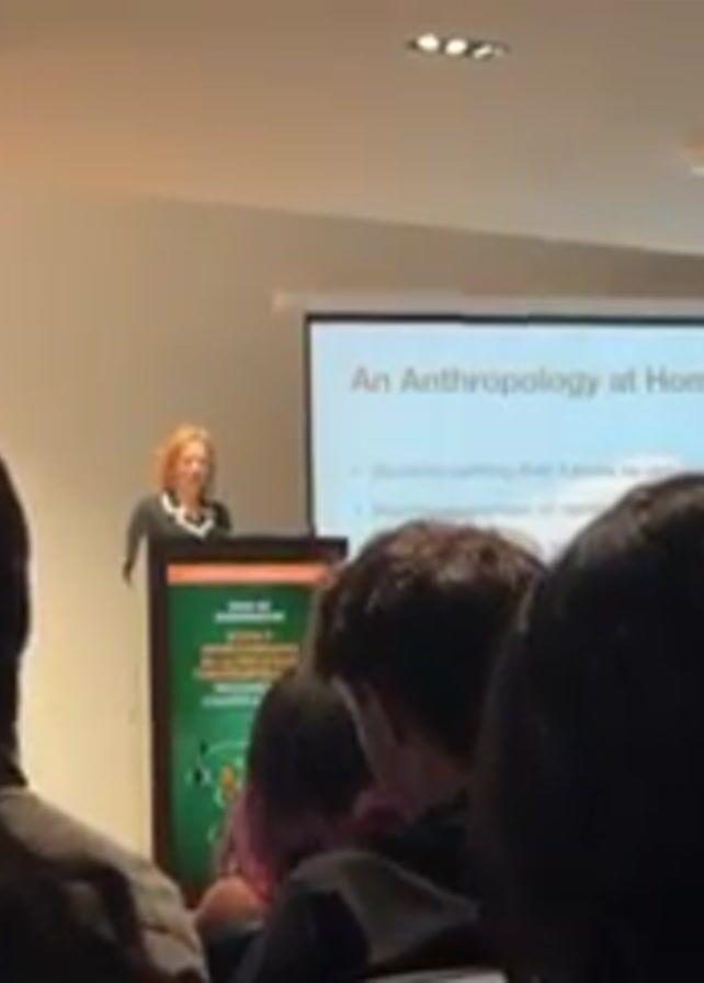 The video depicts a presentation titled “An Anthropology at Home in the World” at what appears to be a university or academic conference