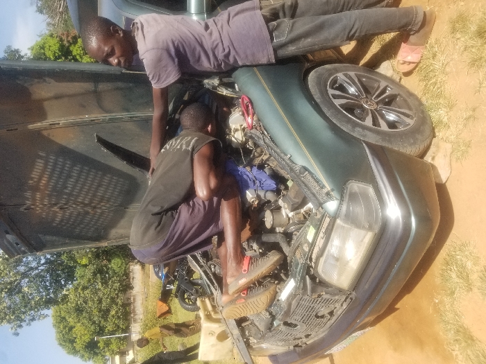 An outdoor scene in Barden Yana, Nigeria, depicts two males attending to a dark green sedan with its hood raised