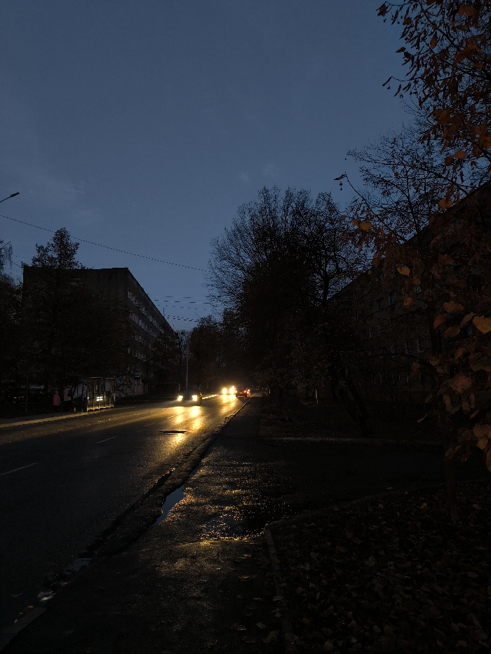 The image depicts a nighttime or late dusk scene on a wet urban street in Vinnytsia, Ukraine. A multi-lane asphalt road runs diagonally through the center, reflecting bright yellow-white light from oncoming vehicle headlights due to a wet surface and several puddles. At least four vehicles are visible in the distance, their headlights illuminating the road. On the left side of the road, a large, dark, multi-story residential building with numerous windows is visible, partially obscured by bare trees. In front of this building, near the roadside, is what appears to be a bus stop or public transport shelter with some illuminated elements. Two indistinct human figures, one wearing a light-colored top, are visible near this shelter. Overhead utility lines stretch across the street. The right side of the road features a dense line of dark, largely bare trees. A second, similarly styled residential building is partially visible behind these trees. In the extreme foreground on the right, branches with reddish-brown autumn leaves are present. The immediate foreground on the right consists of a dark, unpaved area covered in fallen leaves and several puddles. The sky above is a deep blue-grey, suggesting the early night or late twilight hours.