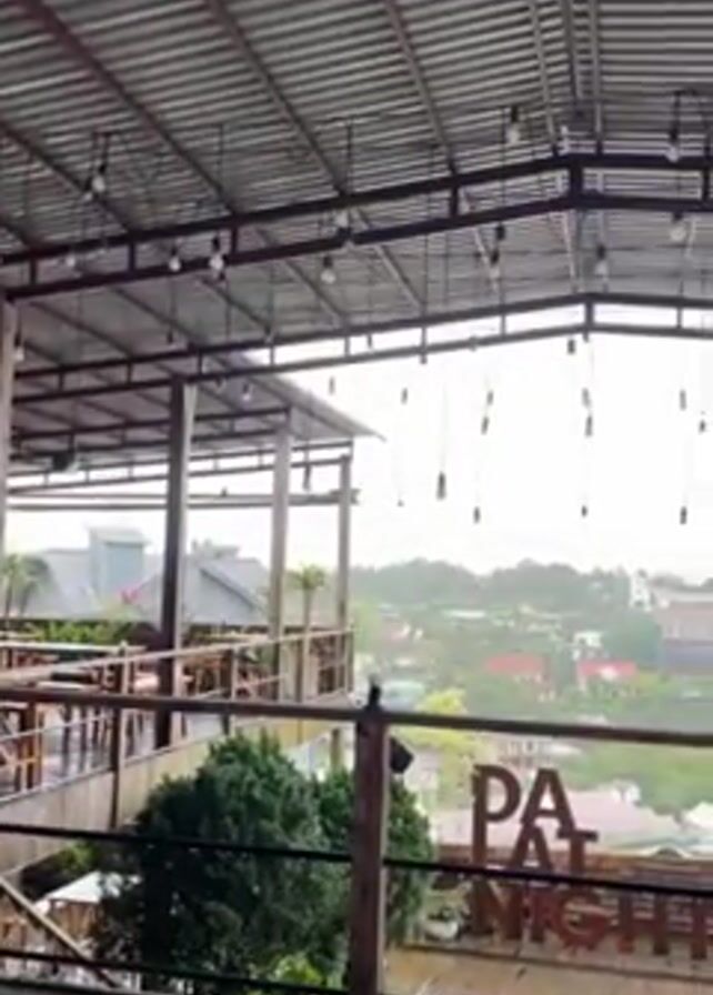 multi-level wooden structure, possibly a cafe or restaurant, with a corrugated metal roof. Hanging lights are visible beneath the roof. It is raining, and the deck is wet. The lower level of the structure is visible below the deck. The signage "PAL NIGHTS" is prominent in the foreground. The background shows a cityscape with buildings and trees, obscured by the rain. The camera slowly pans from left to right.