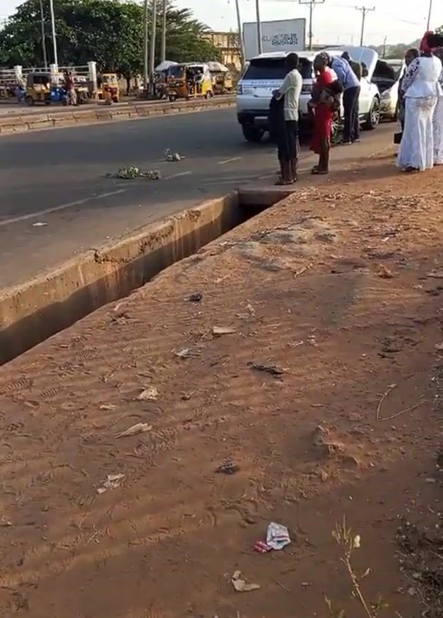road with two cars stopped on it, with people standing around them. One of the cars is white and the other is silver. The hood of the white car is open and a man is looking at the engine. The trunk of the silver car is open. Several people dressed in white are standing nearby. There are other vehicles, including a yellow three-wheeled vehicle, on the road as well. A concrete drainage ditch runs along the side of the road, and the ground next to it is dirt and scattered trash. There are utility poles and billboards visible in the background. The scene appears to be in a commercial or semi-urban area.