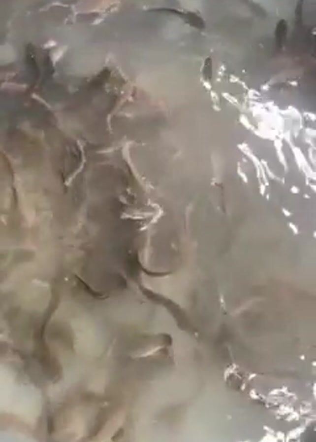 multitude of fish swimming in cloudy water. The fish appear to be of similar size and color. The water's clarity is reduced, obscuring the bottom of the container. The fish are densely packed together, moving around each other within the limited space.