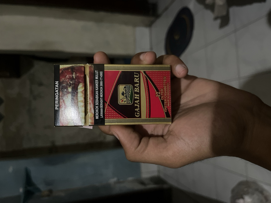 person's hand holding a pack of "Gajah Baru" cigarettes, which are made in Indonesia
