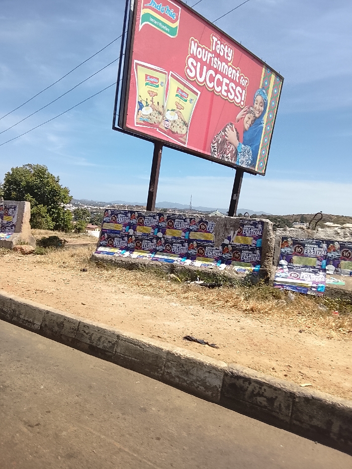 This image depicts a roadside scene in Jos, Nigeria, under a clear blue sky. A large red billboard advertising "Indomie Instant Noodles" is prominent in the upper frame, displaying the slogan "Tasty Nourishment for SUCCESS!". The billboard features two packets of instant noodles and two smiling females, an adult in a blue hijab and a younger individual, implying a familial relationship. The billboard is supported by two dark metal poles. Below the billboard, a low, weathered concrete barrier is heavily covered with multiple, identical, overlapping posters. These posters, predominantly blue and purple, advertise an "ANNUAL HOLY GHOST FESTIVAL" and display the number "16". The ground adjacent to the barrier consists of dirt and dry grass. In the foreground, an asphalt road is separated from this verge by a grey concrete curb. The background reveals distant green trees and buildings to the left, and arid hills with scattered structures to the right.