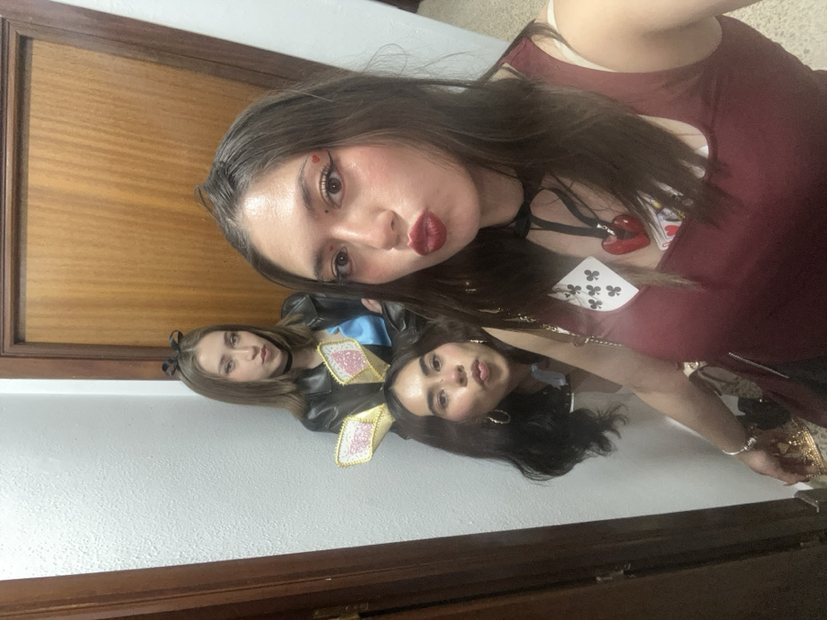 Three young women are captured in a selfie indoors. The woman in the immediate foreground, positioned on the right, has long dark hair and wears a dark red sleeveless top, a black choker with a red heart pendant, and playing cards, including a six of spades, visible in her neckline. She applies dark red lipstick and has heart-shaped eyeliner, with her lips pursed. Behind her, in the center-left, a second woman with dark, wavy hair wears golden, glittery bunny ears and hoop earrings, also with pursed lips. In the background, a third woman with shoulder-length light brown hair wears a black leather-look jacket over a light blue top and a black choker adorned with a small bow, looking directly at the camera. The environment features a textured white wall on the left and a light brown wooden door or paneling with a darker frame on the right. The precise location within Jerez, Spain, cannot be determined from the visual information presented.