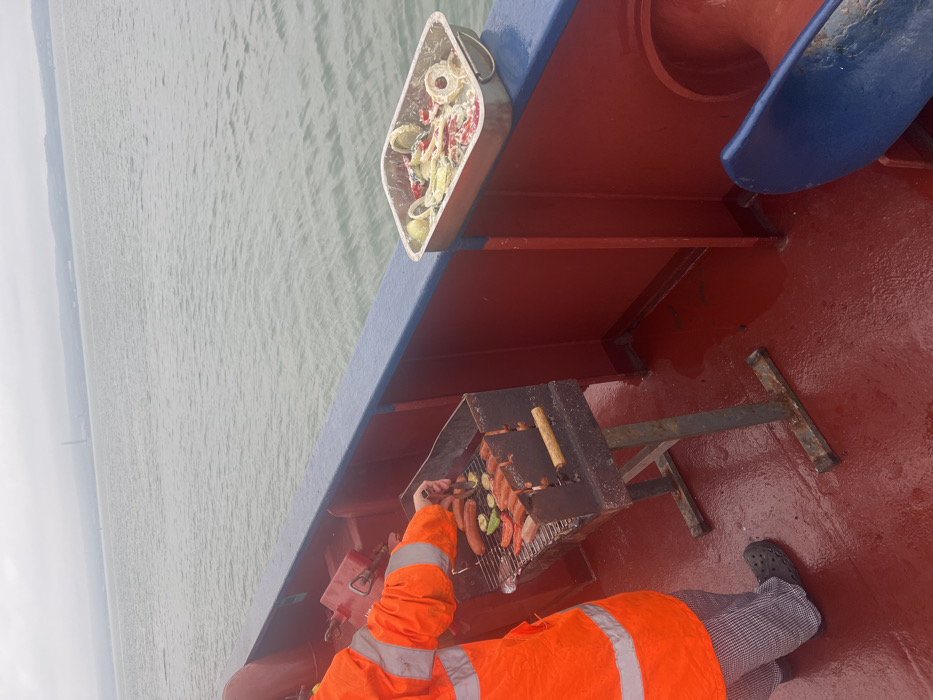The image displays a barbecue scene on the wet, red-painted deck of a vessel, near Bangor, United Kingdom