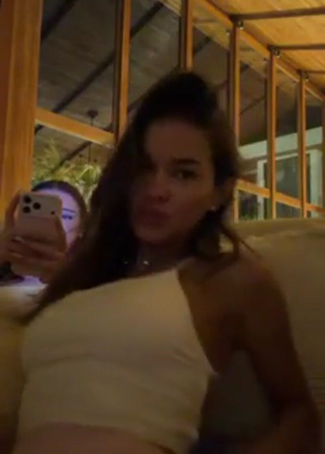A woman in a white tank top is sitting on a couch, looking at the camera and making duck lips. Another woman is in the background, looking at a cell phone. They are in an open-air lounge with wooden framing. The woman in the white tank top makes a peace sign with her fingers.