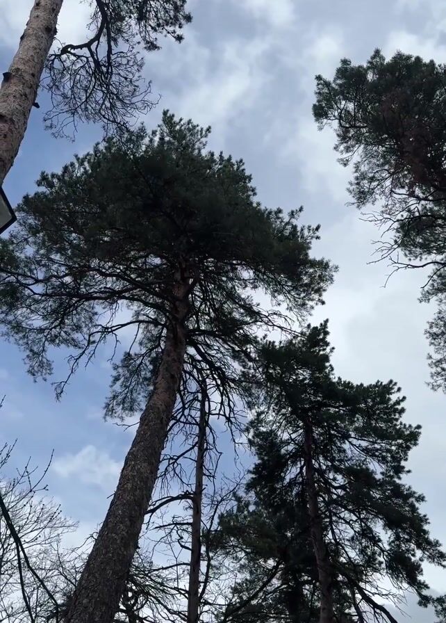 The camera is pointed upward towards the sky, where tall trees frame the view. The sky is a mix of light blue and white, with scattered clouds creating a somewhat overcast effect. The trees vary in appearance; some have dense, dark green foliage at their tops, while others are more bare with only a few branches visible. A black, box-shaped object is noticeable on the left side of the frame, attached to the trunk of one of the trees. The trees are silhouetted against the bright sky, and the overall scene gives a sense of being in a forest or park. The only sound present is bird song.
