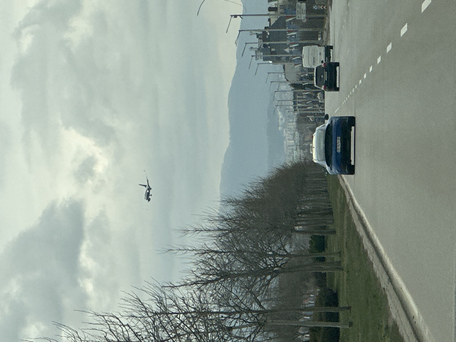 The image depicts an outdoor scene on an overcast day in Sofia, Bulgaria. A dark-colored passenger aircraft with extended landing gear is visible in the upper portion of the frame, appearing to be on a low approach. The foreground features a multi-lane asphalt road with white lane markings. A dark blue sports car, displaying the Bulgarian license plate 'CB 7678 OB', occupies the right lane, moving away from the viewer. Following the sports car are a dark SUV and a white cargo van. To the left of the road, a grassy median runs alongside a row of bare deciduous trees. The right side of the road features streetlights and various urban buildings. A distant cityscape is visible below a prominent mountain range, consistent with Vitosha Mountain, which forms the horizon. The location is consistent with a major road near Sofia Airport.